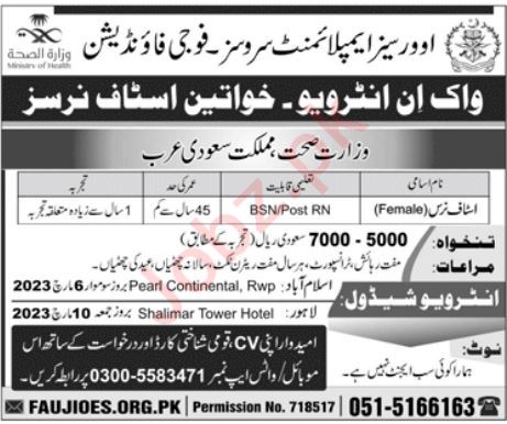 Prospective candidates who like to apply for Staff Nurse Jobs may directly appear in interviews at the Fauji Foundation OES Offices in Lahore and Islamabad from March 6 through March 10, 2023.